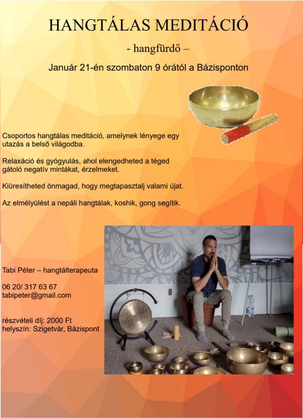 Egy szombati programlehetőségre hívjuk fel a figyelmeteket. Első alkalommal szerveznek nálunk hangfürdőt, s reméljük hogy később is sokszor találkozunk még ezen a foglalkozáson!
