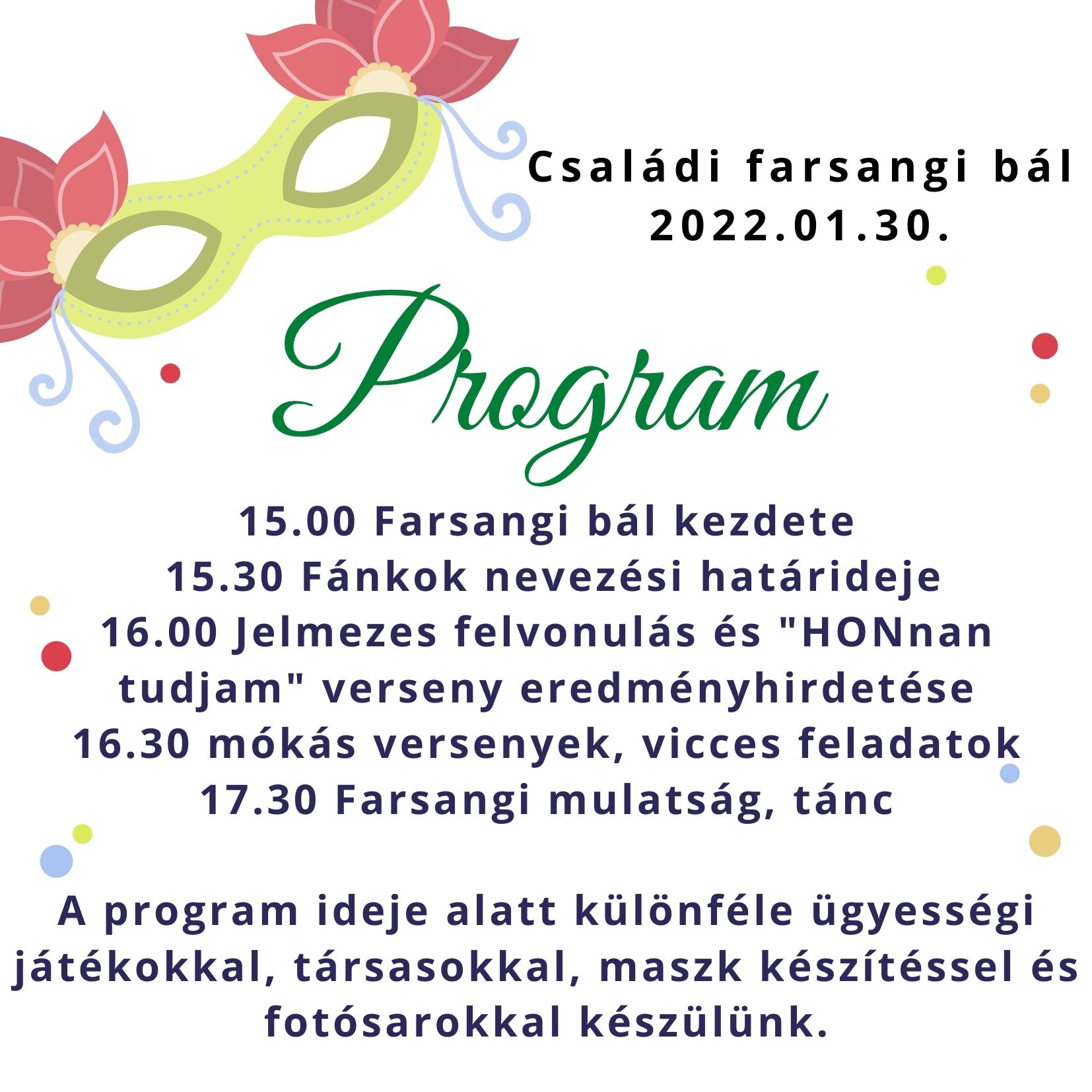 Minden hónap utolsó hétvégéjére családi programot szeretnénk szervezni, így január 30-án, vasárnap családos farsangi bulit szervezünk a BázisPont Közösségi Térbe. Részleteket facebook oldalunkon, a meghirdetett eseménynél találtok!